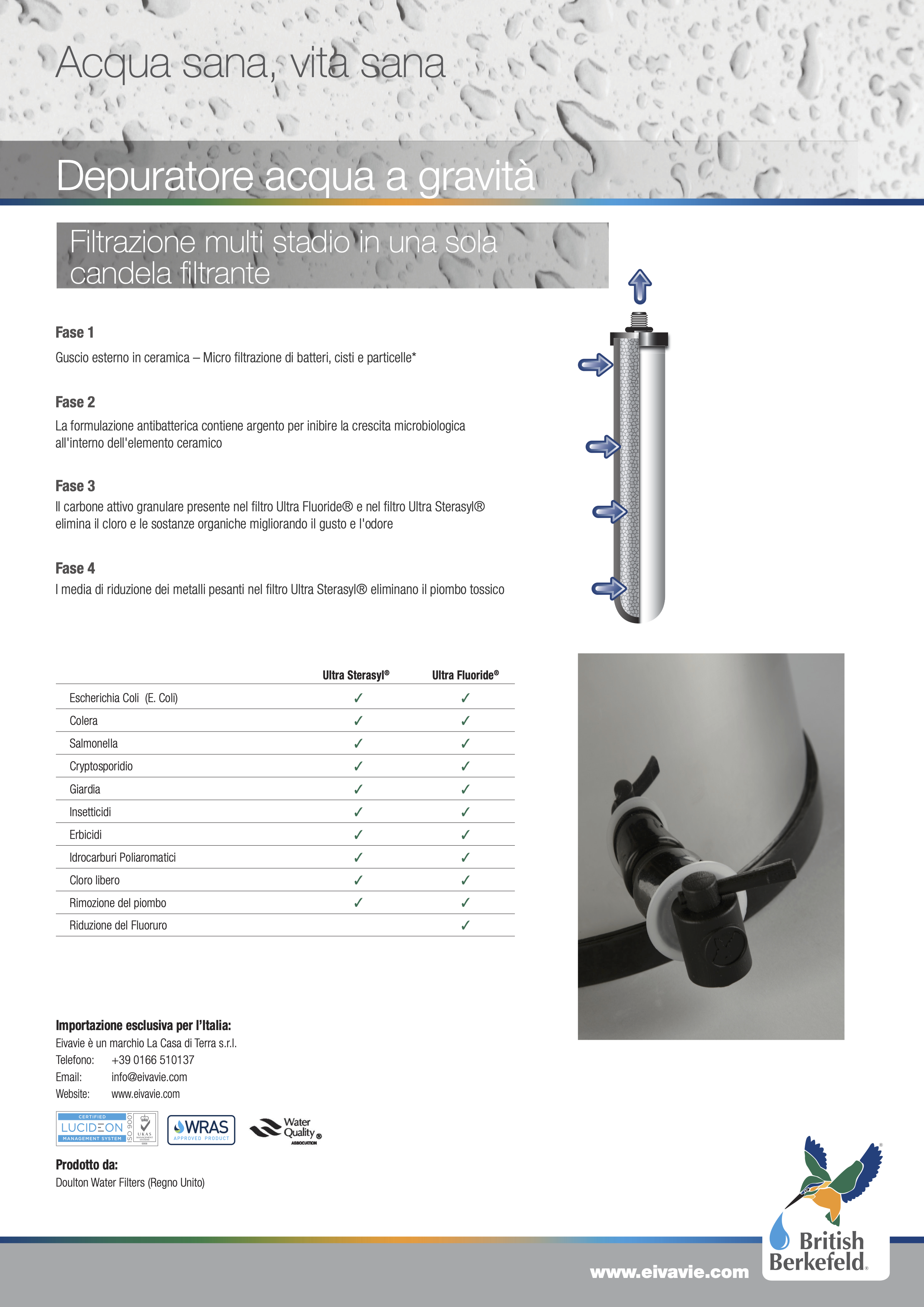 | Manutenzione | Sostituzione del filtro ogni 6 mesi, pulizia della ceramica se si riduce la velocità di filtrazione |