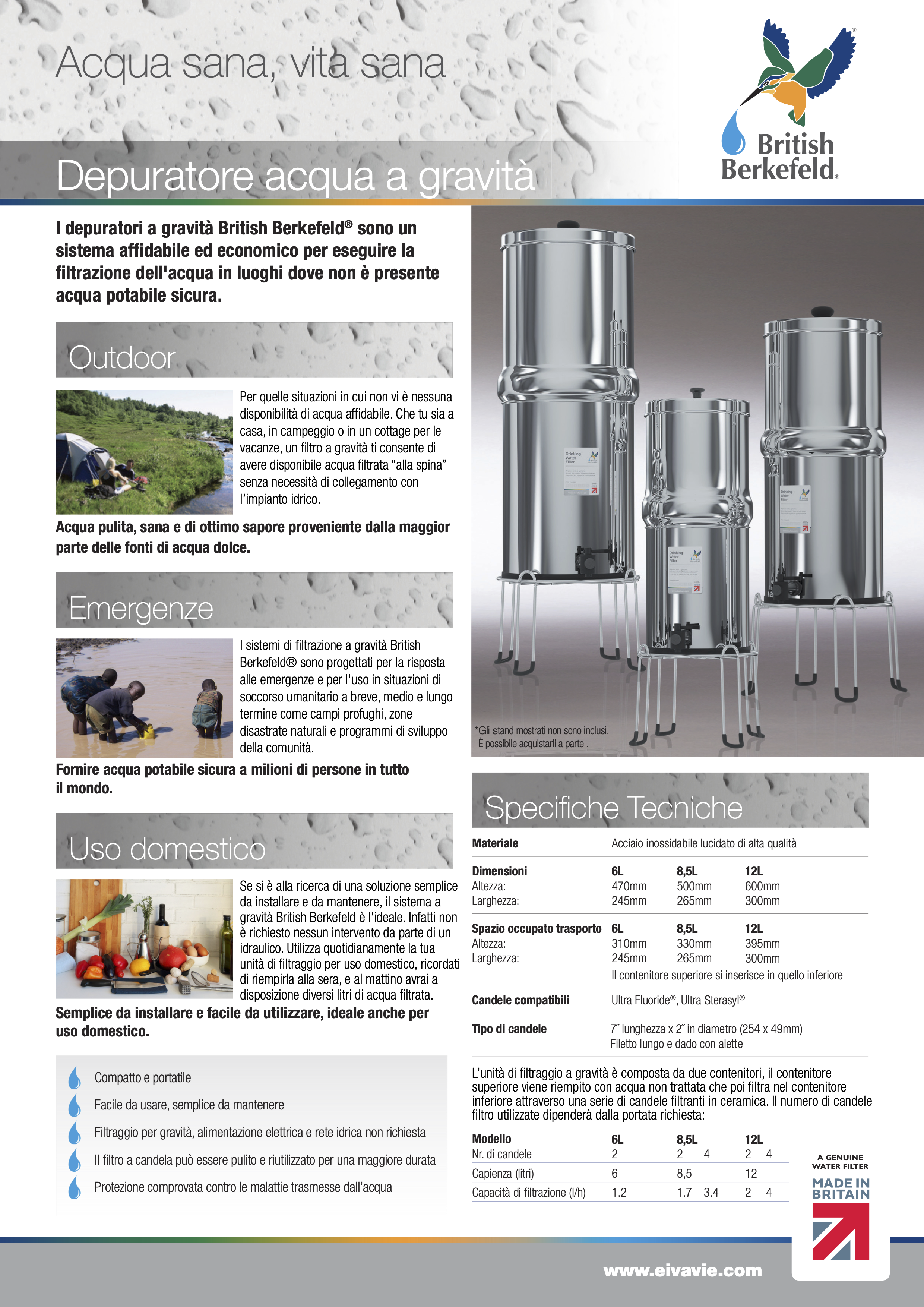 Ideali per abitazioni, piccoli uffici (come alternativa ai boccioni), campeggi, case isolate e persino in situazioni d’emergenza – come calamità naturali o missioni umanitarie – i depuratori Gravity garantiscono acqua potabile sempre a disposizione, senza complicazioni.