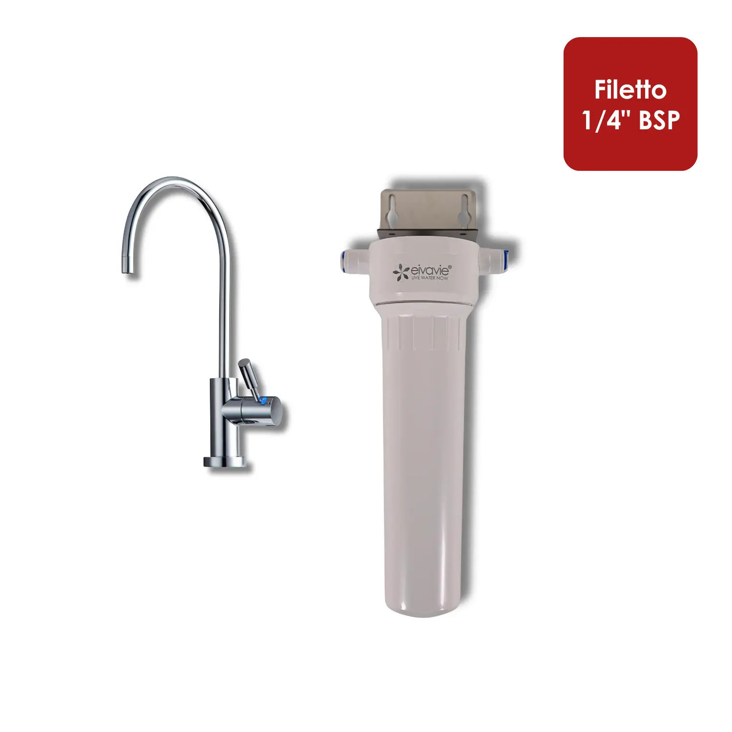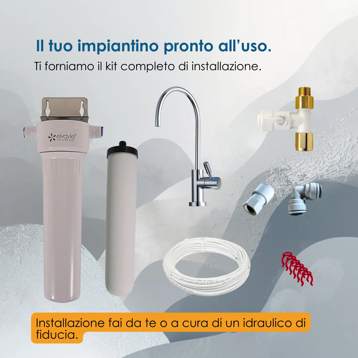 Il pacchetto sotto lavello Eivavie comprende un rubinettino a 1 via per l'erogazione dell'acqua filtrata. Le unità di filtrazione sotto lavello Eivavie® occupano poco spazio sotto al lavello e sono realizzate per garantire resistenza e durabilità. Il sistema non necessita di alimentazione elettrica ed è compatibile con i filtri a candela in ceramica con attacco 1/4" BSP corto, ad esempio il filtro Advanced Ceramicae e il filtro Ultimate Ceramicae, certificati e progettati per migliorare il gusto dell’acqua e ridurre la presenza di sostanze indesiderate. L'installazione è semplice e può essere eseguita in autonomia se si hanno un po' di competenze di fai da te. Altrimenti è consigliato rivolgersi ad un idraulico di fiducia.
