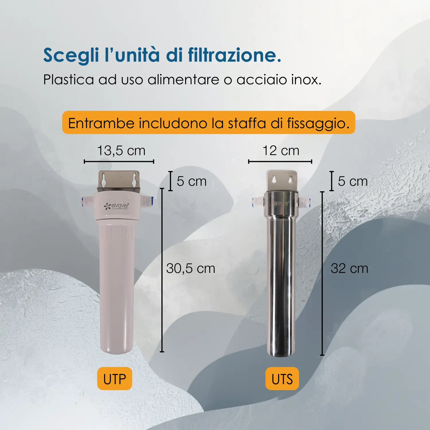 - 1x unità di filtrazione a scelta tra Utp in plastica alimentare e Uts in acciaio inox, entrambe con attacco IN-OUT da 3/8″ e compatibili con candele filtranti con attacco filettato da 1/4″ BSP