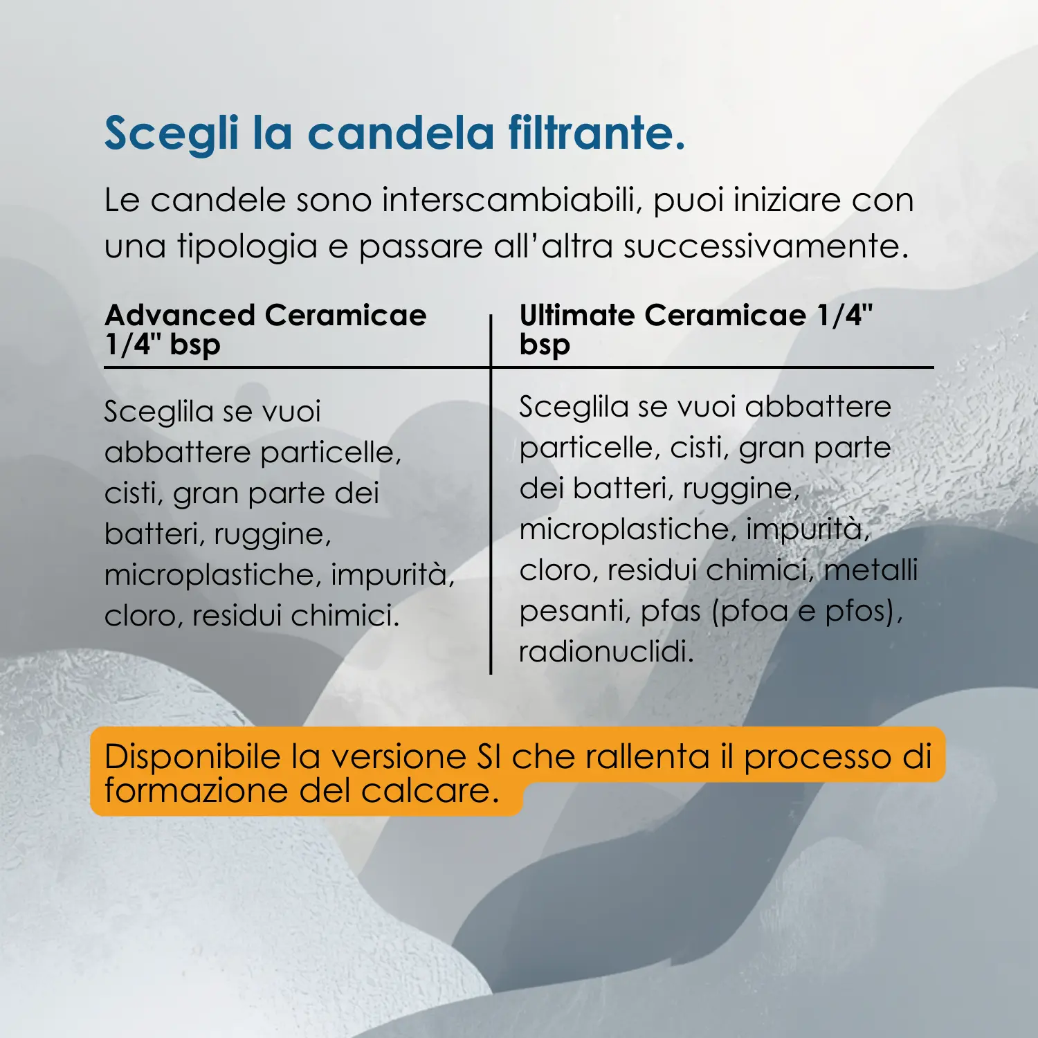 - Durata della candela filtrante: 2300 litri o 6 mesi*